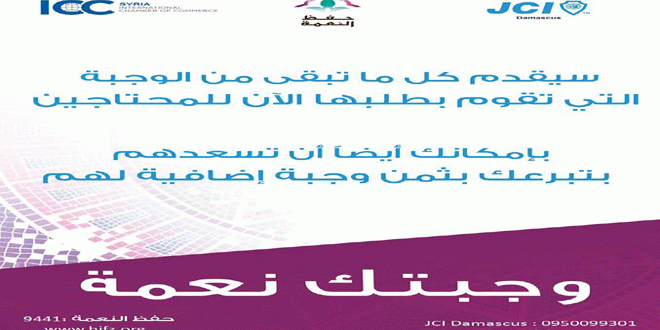 مع بداية شهر الخير والإحسان وبهدف نشر قيم المحبة والتشاركية بين الناس أطلقت الغرفة الفتية الدولية فى دمشق بالتعاون مع جمعية حفظ النعمة الأهلية حملة وجبتك نعمة حيث يقوم شباب متطوع بتوزيع الوجبات الغذائية على الشرائح المحتاجة لسد بعض احتياجاتها اليومية.