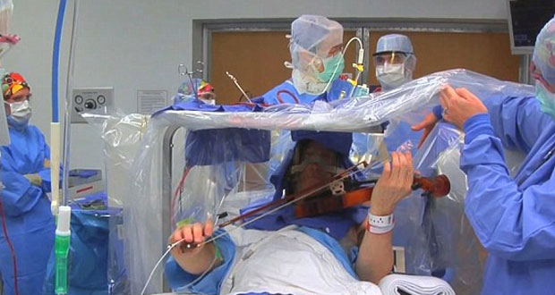 ساعد عازف كمان أميركي مصاب بارتجاف في يديه الجراحين على تحديد المكان المسؤول في دماغه عن الرجفة بشكل دقيق وذلك من خلال العزف على آلته أثناء العملية.