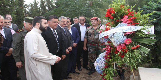 ووضع المشاركون اكليلا من الزهور على ضريح الشهيد وقروءوا الفاتحة على أرواح الشهداء الطاهرة موءكدين على قيم الشهادة ومعانيها السامية والولاء للوطن والوقوف صفا واحدا الى جانب رجال الجيش العربى السوري والقوات المسلحة فى مواجهة الحرب الإرهابية التى تتعرض لها سورية.