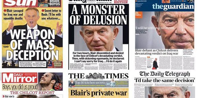 أكملت الصحف البريطانية اليوم ما بدأه تقرير لجنة التحقيق البريطانية بخصوص مشاركة بريطانيا في احتلال العراق الذي صدر أمس وتهكمت على رئيس الوزراء الأسبق توني بلير معتبرة أنه “يهذي للدفاع عن موقفه”.