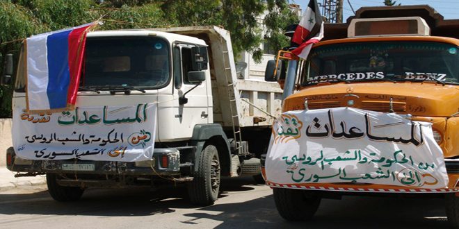 وأوضح ممثل مركز التنسيق الروسي في حميميم العقيد ايغور أن المساعدات الإنسانية تعبير رمزي عن دعم الشعب الروسي للسوريين في مواجهة الإرهاب الدولية مؤكدا أن هذه المساعدات “متواصلة حتى إعادة الأمن إلى جميع الأراضي السورية”.