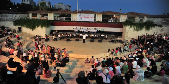 أحيا قرابة مئة طفل وطفلة على مسرح الهواء الطلق بحديقة تشرين بدمشق اليوم فعاليات حفل لحن الحياة الذي أقامته جمعية نور للإغاثة والتنمية للأعضاء المنتسبين لمراكز الجمعية بالتعاون مع فرقة أدونيا الغنائية.