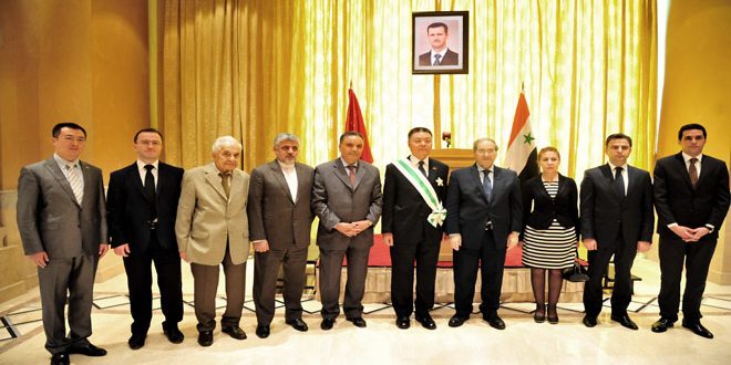 وقلد نائب وزير الخارجية والمغتربين الدكتور فيصل المقداد السفير الصيني وسام الاستحقاق من الدرجة الممتازة تقديرا للجهود التي بذلها في تطوير العلاقات بين البلدين.