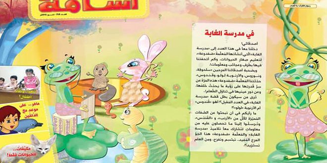 وخصصت أسامة زاوية أسرار الطبيعة للحديث عن الحيوانات التي تتكيف مع الصحراء بينما تضمنت زاوية سيناريو قصة عالمية بعنوان “سر الكوخ المهجور” كما خصصت زاوية “من سورية” للحديث عن مدينة حمص وتاريخها ومكانتها العريقة تحت عنوان “جارة العاصي وأم الحجار السود”.