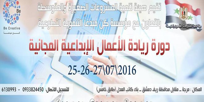 تقيم هيئة تنمية المشروعات المتوسطة والصغيرة بالتعاون مع مؤسسة “كن مبدعاً” التنموية التطوعية دورة تدريبية مجانية بعنوان “ريادة الأعمال الإبداعية” حيث تتضمن الدورة التي تقام في مقر الهيئة في دمشق عددا من ورشات العمل الهادفة الى تنمية المهارات لدى جيل الشباب ونشر ثقافة العمل الريادي تحفيزا على مزيد من الانخراط الجاد والنوعي في سوق العمل المحلية.