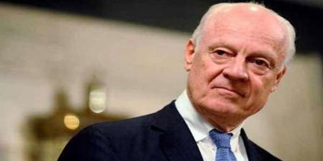 بحث مبعوث الامين العام للأمم المتحدة الخاص الى سورية ستافان دي ميستورا في طهران اليوم مع مساعد وزير الخارجية الإيراني للشؤون العربية والافريقية حسين جابري أنصاري سبل دفع عملية التسوية السياسية للازمة في سورية0