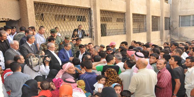 تفقد اللواء محمد الشعار وزير الداخلية والدكتور نجم الأحمد وزير العدل ومحافظ ريف دمشق علاء ابراهيم اليوم أوضاع المقيمين في أحد مراكز الإيواء في عدرا بمحافظة ريف دمشق الذين نزحوا جراء الجرائم الوحشية التي ارتكبتها التنظيمات الارهابية المسلحة في الرقة وحلب ودير الزور وغيرها من المحافظات السورية.
