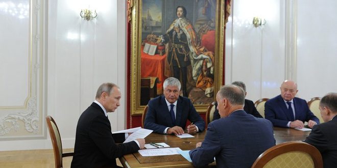 بحث الرئيس الروسي فلاديمير بوتين مع الأعضاء الدائمين في مجلس الأمن القومي الروسي الوضع في سورية إلى جانب قضايا أخرى مطروحة على جدول الأعمال الاقتصادي والاجتماعي في روسيا.