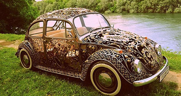وتبدو السيارة الغريبة التي وكأنها من طراز بيتلز من فولكس فاغن الألمانية المعرفة بالخنفساء شفافة حتى إن بإمكانك أن ترى جميع محتوياتها وكأن ركابها يجلسون داخل صندوق زجاجي ملتف حوله هيكل مصنوع من الحديد المشغول الفيرفورجيه الذي حمل لون الذهب.