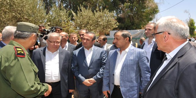 تفقد وزراء الداخلية اللواء محمد الشعار والعدل الدكتور نجم حمد الأحمد والإدارة المحلية والبيئة المهندس حسين مخلوف اليوم أوضاع المقيمين في مركز إيواء معسكر الطلائع في قرية رساس بمحافظة السويداء والذين وفدوا إليها هربا من جرائم التنظيمات الإرهابية المسلحة في الرقة وحلب ودير الزور وغيرها من المحافظات.