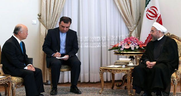 ودعا روحاني خلال لقائه اليوم مدير الوكالة الدولية للطاقة الذرية يوكيا أمانو الذي يزور طهران حالياً لبحث مسيرة التعاون بين إيران والوكالة الدولية إلى أن تضطلع الوكالة “بدور مؤثر” في حل الملف النووي الإيراني مؤكداً أن طهران جادة في المباحثات النووية الجارية مع مجموعة خمسة زائد واحد والوكالة الدولية للطاقة الذرية ولا تريد أكثر من حقوقها المشروعة ومنها عملية التخصيب للأهداف السلمية.