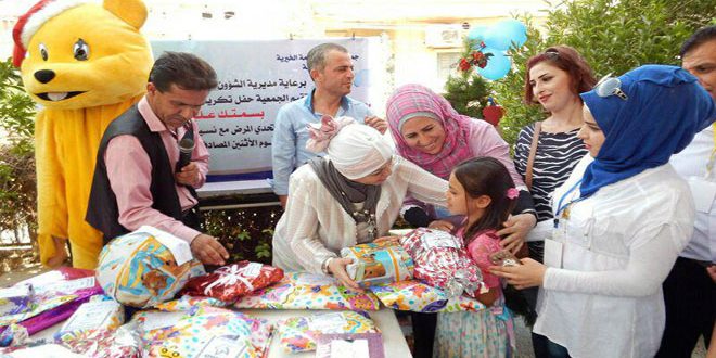 وذكر رئيس الجمعية سعيد الخضر في تصريح لمراسل سانا أنه تم تكريم 35 من الأطفال المصابين بأمراض السرطان والسكري والمعوقين بفقدان البصر أو السمع والذين يعانون من الإصابة بمتلازمة داون مبينا أن حفل التكريم جاء بمبادرة من الشابات والشباب المتطوعين بالجمعية.