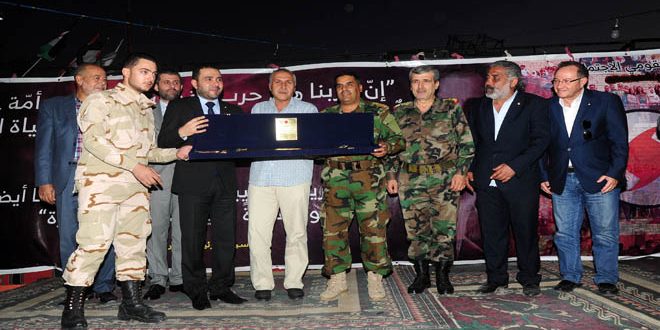 من جانبه أوضح عضو المجلس الثوري لحركة التحرير الوطني الفلسطينية “فتح الانتفاضة” أبو فراس قبلاوي أن الجيش العربي السوري قدم التضحيات من أجل تحرير فلسطين منذ 1948 ويخوض المعارك لاستعادة الحق العربي والسوري والفلسطيني لافتاً إلى أن “جيش التحرير الفلسطيني يقاتل في الدفاع عن سورية إلى جانب جيشها في مواجهة الإرهاب التكفيري الذي هو وجه آخر للإرهاب الصهيوني”.