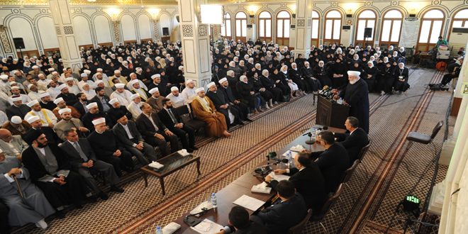 وفي كلمه له قال وزير الأوقاف الدكتور محمد عبد الستار السيد “إن سورية تتعرض لأخطر هجمة ومؤامرة شيطانية دولية ماكرة تستهدف وجودها وحاضرها وماضيها و مستقبلها”.