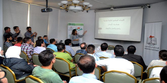 عضو المكتب التنفيذي للاتحاد الوطني لطلبة سورية رئيسة مكتب التعليم الخاص دارين سليمان عرضت في المحاضرة مراحل نهوض الاتحاد وتأسيسه وأهدافه لافتة إلى حرص الاتحاد خلال السنوات الماضية على تعزيز مفهوم المواطنة والانتماء بين الفئات الشابة وإنجاز العديد من المشاريع التطوعية الوطنية.
