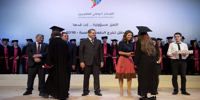 استكمالا لدوره في رفد المجتمع بشباب متميز وطاقات إبداعية واعدة قادرة على مواكبة التطورات العلمية وتلبية حاجات مؤسسات الوطن من الكوادر الكفوءة قام المركز الوطني للمتميزين اليوم بتخريج الدفعة الخامسة من طلابه بحضور السيدة أسماء الأسد وذلك في دار الأسد للثقافة باللاذقية.