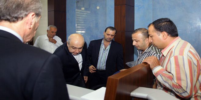 تفقد وزير الموارد المائية المهندس نبيل الحسن واقع العمل وآلية الجباية في عدد من مراكز خدمة المشتركين التابعة للمؤسسة العامة لمياه الشرب والصرف الصحي بدمشق.
