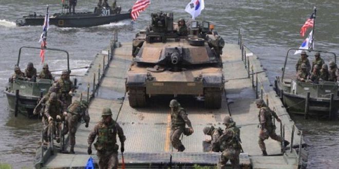 يذكر أن المناورات التي تجريها الولايات المتحدة وكوريا الجنوبية سنوياً والتعاون العسكري بينهما يزيد من حدة التوتر في منطقة شبه الجزيرة الكورية ويمنع إحلال السلام الدائم بين الكوريتين.