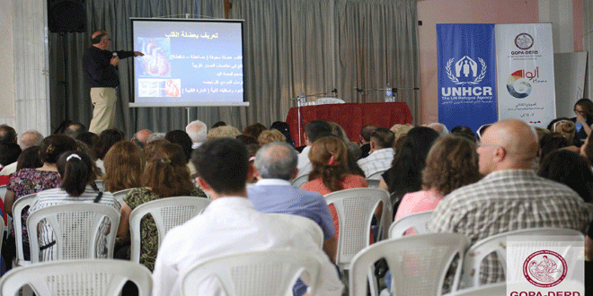 أما اللون الثانى فتضمن تكريم الطالبة المتفوقة فى شهادة التعليم الأساسى سارة أمين الصباغ من بلدة قطينة بريف حمص إضافة إلى محاضرة للمحامى العام بحمص فارس صطوف تناول فيها المشكلات الزوجية خلال الأزمة وأسبابها وطرق الحد والوقاية منها.