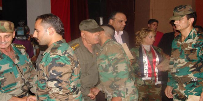 وتضمن حفل التكريم عروضا فنية قدمتها فرقة مسك أحمر وعددا من الفقرات الغنائية والقصائد الشعرية واللوحات الفنية التي تعبر عن بطولات الجيش العربي السوري.