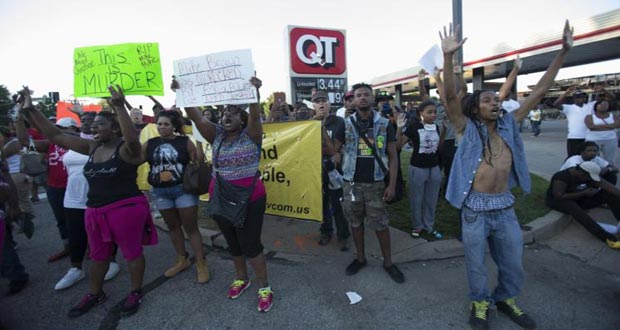 ومنذ مقتل الشاب يجوب محتجون الشوارع داخل وحول المنطقة التي قتل فيها ويحمل المتظاهرون لافتات ويرددون هتافات ويطالبون بإعتقال ضابط الشرطة دارين ويلسون الذي أطلق النار على براون وأغلقت المدارس في المنطقة اليوم بسبب الاضطرابات داخل وحول المدينة التي يعيش فيها نحو 21 ألف شخص.