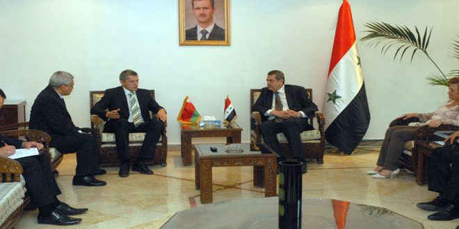 بحث وزير التعليم العالي الدكتور عاطف نداف مع سفير جمهورية بيلاروس بدمشق الكسندر بانوماريف اليوم علاقات التعاون في مجال التعليم العالي والبحث العلمي وإعادة تفعيل البرنامج التنفيذي لاتفاق التعاون الثقافي وزيادة المنح بين البلدين.