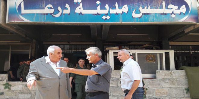 وخلال جولة له اليوم على مجلس مدينة درعا ومراب المجلس الموجود في حي المطار أشار المحافظ إلى دور عمال مجلس المدينة في أداء الخدمات للمواطنين وإصرارهم على استمرار الحياة و البناء وإعادة الإعمار والدفاع عن الممتلكات العامة جنبا الى جنب مع بواسل الجيش العربي السوري.
