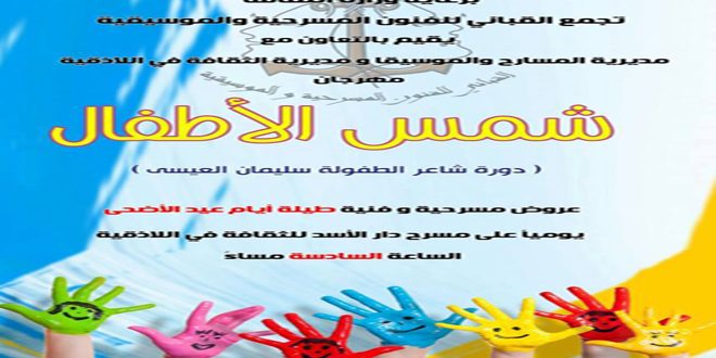 يفتتح عند الساعة السادسة من مساء الأحد القادم مهرجان شمس الأطفال دورة شاعر الطفولة سليمان العيسى الذي ينظمه تجمع القباني للفنون المسرحية والموسيقية ومديرية الثقافة في اللاذقية وذلك على مسرح دار الأسد للثقافة والفنون في المدينة.