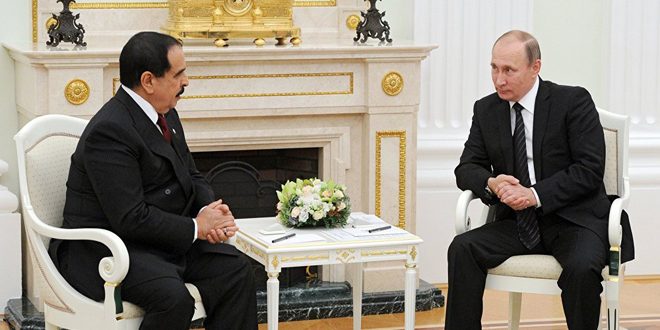 بحث الرئيس الروسي فلاديمير بوتين مع ملك النظام البحريني حمد بن عيسى آل خليفة الأزمة في سورية ومكافحة الإرهاب وآخر التطورات الإقليمية والدولية إضافة إلى العلاقات الثنائية.