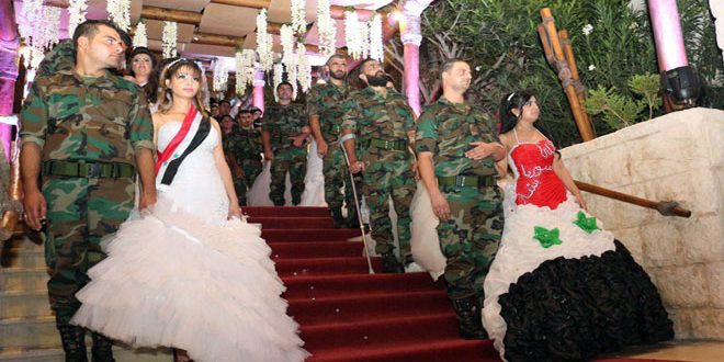قلوب ملأتها الشجاعة والإقدام وزكاها عبير الحب المقدس اجتمعت مساء أمس لتعلن ارتباطها الأبدي أمام مئات الحاضرين ضمن حفل زفاف جماعي كبير أقامته شركة سيريتل لمئة وعشرين شابا وشابة من أبطال الجيش العربي السوري وذوي الشهداء فكان عرسا مفعما بعبق النصر وروح الشهادة والتضحية من أجل سورية التي يقاتلون دفاعا عنها لتكون أرضا آمنة لأجيال قادمة من أبنائهم وأبناء السوريين جميعا.