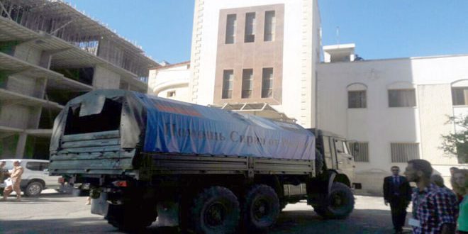 وقدمت روسيا الاتحادية خلال الأشهر الماضية في إطار دعمها لسورية في مواجهة الحصار الجائر المفروض من الغرب وبعض الدول الإقليمية مواد ومساعدات طبية للعديد من المشافي ولا سيما مشفى تشرين الجامعي في اللاذقية ومشفى حلب الجامعي إضافة إلى توزيع مئات الأطنان من المساعدات على الأهالي المتضررين من جرائم الإرهابيين.