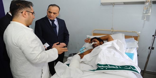 زار رئيس مجلس الوزراء المهندس عماد خميس جرحى الجيش والقوات المسلحة في مشفى الشهيد يوسف العظمة بدمشق بمناسبة عيد الأضحى المبارك واطمأن على صحتهم وهنأهم بحلول العيد واستمع منهم إلى ظروف تعرضهم للإصابة خلال تصديهم للمجموعات الإرهابية المسلحة التي تحاول تدنيس قدسية تراب الوطن.