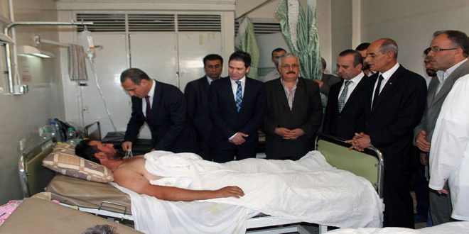 كما زار الوفد الوزاري جرحى الجيش العربي السوري في المشفى الوطني بحماة واطمأنوا على صحتهم وقدموا لهم التهاني بحلول العيد واستمعوا لشرح عن الخدمات الطبية المقدمة لهم.