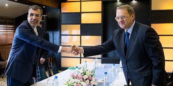 وبحسب بيان صدر عن وزارة الخارجية الروسية في أعقاب المشاورات التي أجراها ميخائيل بوغدانوف مبعوث الرئيس الروسي الخاص إلى الشرق الأوسط وأفريقيا نائب وزير الخارجية وحسين جابري أنصاري مساعد وزير الخارجية الإيراني للشؤون العربية والأفريقية في موسكو أمس نقلته وكالة الأنباء الإيرانية إرنا فإن الطرفين أعربا عن ارتياحهما إزاء موقف الحكومة السورية البناء إزاء تنفيذ التزاماتها الخاصة بتطبيق نظام وقف الأعمال القتالية وأكدا على ضرورة الالتزام به من قبل مجموعات المعارضة المسلحة وأن أي تصرف آخر من قبلها سيكون دليلا علي تمسكها بالحل العسكري وحده ووقوفها إلى جانب تنظيمي “داعش” و”جبهة النصرة” الإرهابيين.