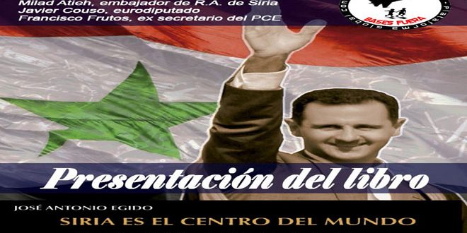 وشدد إخيدو خلال تقديمه كتابه أمس بعنوان “سورية مركز العالم” بحضور حشد من المحتفلين باليوم الوطني للحزب الشيوعي الإسباني على التضامن والتعاضد مع الشعب والقيادة في سورية والتأييد الكامل للجيش العربي السوري وتضحياته المشرفة في مقاومته للتنظيمات الارهابية المدعومة من الإمبريالية الصهيونية مشيرا الى ان مخططات الولايات المتحدة لاستهداف سورية نابعة من رغبتها بوضع حد للأيديولوجية القومية ال