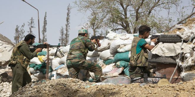 وكانت وحدات من الجيش دمرت أمس عربتي دفع رباعي مزودتين برشاشات ثقيلة ومدفع عيار 5ر14 مم لإرهابيي تنظيم “داعش” وقضت على العديد من أفراده في محيط الكلية الجوية شرق حلب بنحو 40 كم على الطريق الدولية الواصلة إلى الرقة.