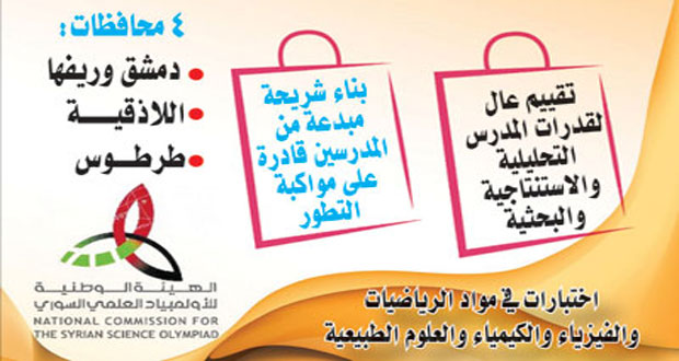 استمراراً لمسيرة نجاح الأولمبياد العلمي كمشروع علمي وطني استراتيجي خاص وتحقيق الإنجازات في أهم وأكبر محافل العلم العالمية، تقيم الهيئة الوطنية للأولمبياد العلمي السوري بالتعاون مع وزارة التربية اولمبياد علمي تجريبي لمدرسي مرحلة التعليم الثانوي في جميع المدارس الخاصة والحكومية لعلوم الرياضيات والفيزياء والكيمياء والمعلوماتية والعلوم الطبيعية وذلك أواخر الشهر الحالي في 4 محافظات هي دمشق، ريف دمشق ، اللاذقية ، طرطوس.
