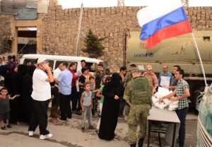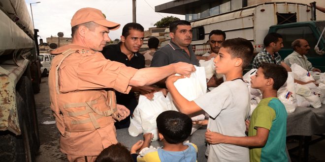 وبين ممثل مركز التنسيق الروسي في حميميم العقيد دانييل ريتشكوف في تصريح لمراسل سانا أن المساعدات تضمنت معلبات متنوعة وطحين وغيرها من المواد الغذائية الأساسية لافتا إلى أن عمليات التوزيع شملت المواطنين القادمين من الأحياء الشرقية عبر المعابر الإنسانية وعدد من الأسر المتضررة من الاعتداءات الإرهابية”.