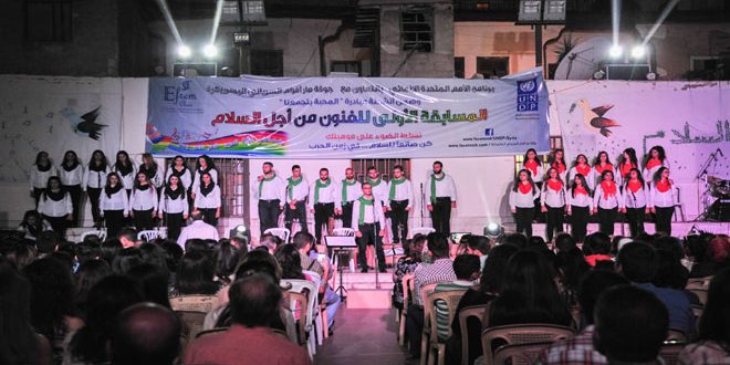 بمناسبة اليوم العالمي للسلام أطلقت جوقة مار أفرام السرياني البطريركية بالتعاون مع برنامج الأمم المتحدة الانمائي أنشطة مبادرة “المحبة بتجمعنا” وذلك خلال حفل غنائي أحييته الجوقة بمشاركة موسيقيي فرقة أدونيا في ملعب نادي الثورة الرياضي بالقصاع في دمشق.