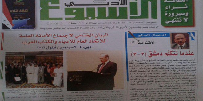 ونشرت الجريدة نصا من البيان الختامي لاجتماع الأمانة العامة للاتحاد العام للأدباء والكتاب العرب الذي ألقاه الدكتور الصالح متضمنا دعوة الأدباء والكتاب العرب والقوى الفكرية والسياسية في الوطن العربي إلى تغليب لغة الحوار على لغة الشحن العرقي والديني والطائفي وإلى تعزيز ثقافة التنوير وإدانة مختلف أشكال الإرهاب داخل الوطن العربي وخارجه ورفض مختلف أشكال التدخل الأجنبي في الشؤءون الداخلية ومواجهة أي محاولة لتقسيم أي دولة عربية إلى وحدات جغرافية أصغر وفق اعتبارات عرقية أو مذهبية.