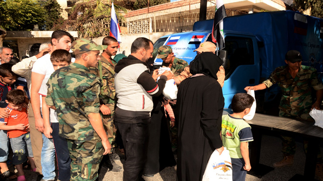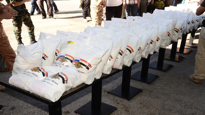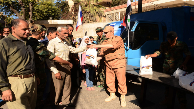 وبين ممثل مركز التنسيق الروسي في حميميم العقيد دانييل ريتشكوف في تصريح لمراسل سانا أن المساعدات عبارة عن سلل غذائية تتضمن معلبات متنوعة وكميات من الطحين والرز وغيرها من المواد الغذائية الأساسية لافتا إلى أن عمليات التوزيع شملت المواطنين القادمين من الأحياء الشرقية عبر المعابر الإنسانية وعددا من الأسر المتضررة من الاعتداءات الإرهابية.