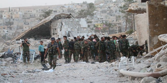 وكانت وحدات من الجيش استعادت أمس الأول عددا من كتل الأبنية من ضمنها نادى حلب وبناء الكهرباء والمرآب في منطقة سليمان الحلبي وذلك بعد يوم من القضاء على المجموعات الإرهابية التي تسللت إلى عدد من النقاط في مخيم حندرات شمال شرق حلب بنحو 13 كم.