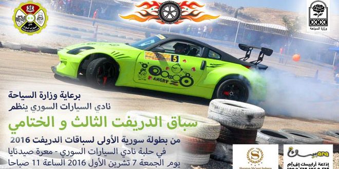 يختم نادي السيارات السوري يوم الجمعة القادم موسمه الرياضي بإقامة الجولة الثالثة والاخيرة من بطولة سورية لسباق الدريفت “رياضة الانجراف” التي ينظمها النادي برعاية وزارة السياحة في حلبة النادي بمعرة صيدنايا في ريف دمشق.
