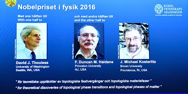 منحت جائزة نوبل للفيزياء لعام 2016 إلى البريطانيين الثلاثة ديفيد ثاوليس وف ودانكن هولداين وج ومايكل كوستيرليتس تقديرا لأبحاثهم حول المادة.
