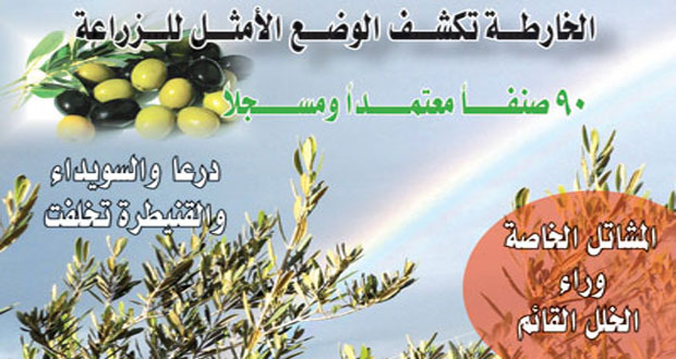 ورأى ملندي أن الخارطة تشكل مرجعاً أساسياً لمزارع الزيتون عند اختياره الصنف المراد زراعته وبما يضمن تحسين الإنتاجية وخفض تكاليف الإنتاج مشيراً أن الخارطة ستظهر الأصناف المناسبة البديلة والمتحملة للظروف البيئية الحيوية.