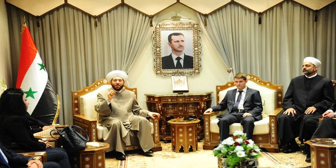 وأشار سماحة المفتي خلال لقائه اليوم الوفد الشعبي الروسي الذى يزور سورية إلى أن “مساندة روسيا لسورية هي إحدى الأسباب التي تقف وراء العقوبات والحرب الاقتصادية التي يشنها الغرب وعلى رأسه الولايات المتحدة الأمريكية على روسيا” معربا عن ثقته بأن هذه “العقوبات ستعود على القوى الغربية بالخيبة والخسارة”.