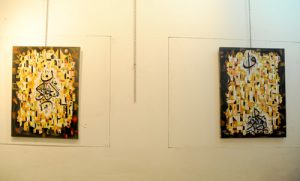وقدم الفنان السامرائي عبر 25 لوحة مجموعة من مفردات التراث العراقي من القباب والمأذنة الملوية التي اشتهرت بها مدينة سامراء والزقورات “الأهرام الرافدية” في تماه مع عبارات من الحرف العربي وخلفيات تجريدية.