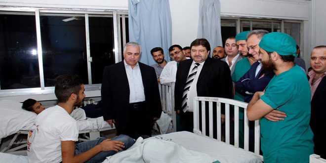 قام وزير الثقافة محمد الأحمد مساء اليوم بزيارة لمشفى المواساة للاطمئنان على الجرحى الذين استهدفوا بقذيفة غدر من المجموعات الإرهابية أثناء مشاركتهم وحضورهم لمهرجان قوس قزح في دار الأوبرا.
