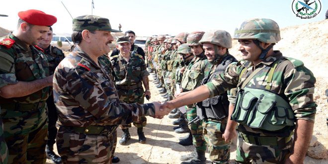 وعبر العماد الفريج عن اعتزاز القيادة العامة للجيش والقوات المسلحة ببطولات الجيش العربي السوري وتضحياته مؤكداً أن “قواتنا المسلحة عاهدت شعبنا على المضي في نهجها المقاوم حتى القضاء على الإرهاب وإحباط مؤامرات رعاته وداعميه”.