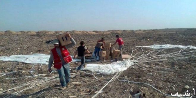 بدأ فرع الهلال الأحمر العربي السوري في دير الزور بتوزيع دفعة مساعدات إنسانية جديدة تم إسقاطها جوا عبر مظلات من قبل الطيران السوري لتوزيعها على الأهالي المحاصرين من قبل تنظيم “داعش” الإرهابي.